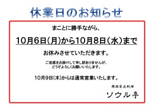 2025年10月 臨時休業のお知らせ 2025年9月30日 お知らせ 10月6日(月)から8日(水)まで、休業させていただきます。 10月9日(木)からは通常営業いたします。ご迷惑をおかけしますが、よろしくお願いいたします。 続きを読む