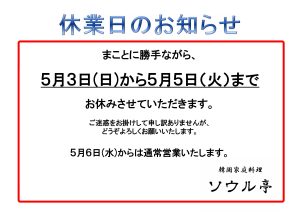 2024年末、休業日のお知らせ 2024年12月12日 お知らせ 2024年12月は、第4日曜日の22日ならびに23日の月曜日は営業いたします。 年内店舗の営業は28日(土曜日)で終了しますが、29日(日曜日)、30日(月曜日)、31日(火曜日)は田尻漁港日曜朝市にてチジミやキムチ、ケ […] 続きを読む